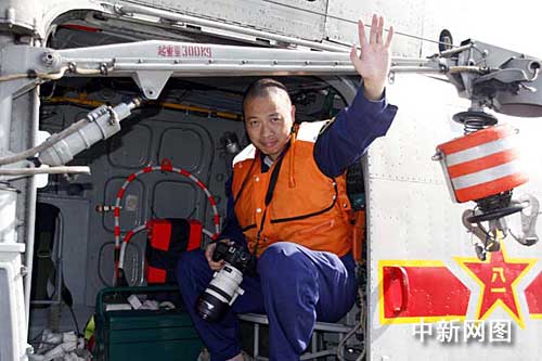 雖然直升機(jī)起飛尚有一段時(shí)間,但急性子的我還是檢查好相機(jī)等采訪拍攝裝備,穿上救生衣,早早地就跑到甲板上守侯著。艦上時(shí)間上午九點(diǎn)多,飛行員和乘機(jī)人員開始登機(jī),中央人民廣播電臺(tái)記者孫利特地趕來(lái),給我拍了一幅起飛前在直升機(jī)上揮手的照片。