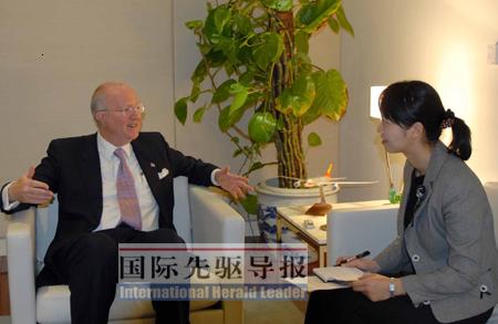 國際先驅(qū)導(dǎo)報(bào)記者熊爭艷發(fā)自北京 在美國駐華使館官員陪同下,經(jīng)過幾道關(guān)卡,在新使館大樓的會(huì)客室內(nèi)才見到了兩鬢斑白、神采奕奕的雷德大使。不到半個(gè)小時(shí)的采訪中,雷德思路清晰,語言幽默,并時(shí)常發(fā)出爽朗的笑聲。