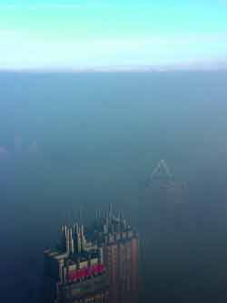 7日一大早,哈市上空灰蒙蒙一片,整座城市被繚繞的大霧籠罩著,樓房都掩映在大霧之中。紅軍街上的華融飯店雙子廈影影綽綽,十分模糊。哈市標(biāo)志性建筑之一——龍塔的上半身也被煙霧“截?cái)唷。在長(zhǎng)江路紅旗大街交口,記者目測(cè)能見度不足50米,馬路對(duì)面就灰茫茫一片。大街小巷隨處可見戴口罩的行人。“早上出門后,感覺大霧很嗆人,就返回家取了個(gè)口罩!笔忻裢踔一壅f!疤斓故遣焕,可這煙太嗆人了!笔忻耨T女士說。