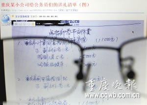 “過年了,企業(yè)開始送錢了!”6日,天涯論壇重慶社區(qū)、重慶記者之家等網(wǎng)站驚現(xiàn)一份給公務(wù)員、檢驗(yàn)站的“送禮清單”。這份清單共涉及20個(gè)紅包,個(gè)個(gè)上千元,最高2000元。