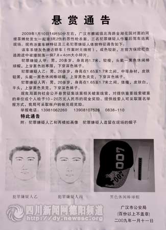 13日上午,記者在廣漢各大街道、小區(qū)看到,廣漢市公安局貼出了懸賞通告,向社會(huì)公開(kāi)懸賞征集廣漢市“1.10”惡性槍殺案相關(guān)破案線索,對(duì)提供重要線索的單位或者個(gè)人,將給予10-20萬(wàn)人民幣現(xiàn)金獎(jiǎng)勵(lì)。提供線索人可以匿名舉報(bào)方式。舉報(bào)電話:13981062260、13908107528、0838-110(記者 李安國(guó))