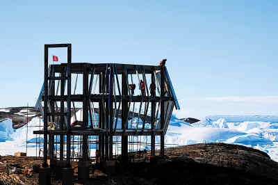 溫度、風(fēng)速、氣壓這些天氣數(shù)據(jù)實時地顯示在餐廳內(nèi)的液晶電視屏幕上。這兩天早上的風(fēng)刮得都比較緊,今天的風(fēng)就有六七級,陣風(fēng)8級。地處東南極大陸沿海,中山站正在南極大陸平均風(fēng)力最大的區(qū)域內(nèi)。去年冬天最大風(fēng)速曾達(dá)到40多米每秒。中山站改造項目經(jīng)理劉篤斌決定等風(fēng)小一些再讓隊員們?nèi)ヅ栏吒苫睢τ谡旧辖佣B三立起來的鋼結(jié)構(gòu)新樓,老劉一拍胸脯說,“基礎(chǔ)打得特別深,再大的風(fēng)也能頂?shù)米。 ?/p>
