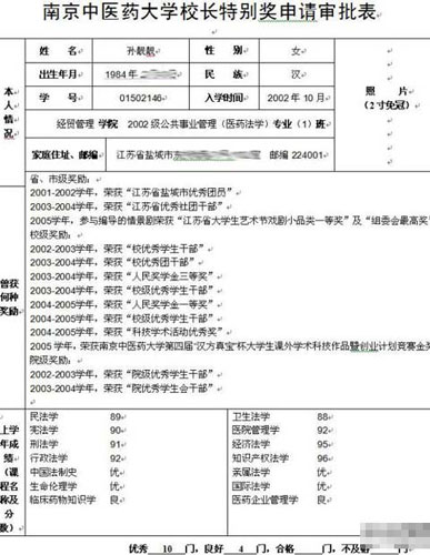 通過網(wǎng)上一份“南京中醫(yī)藥大學校長特別獎申請審批表”里可以看出,孫靚靚是一個各方面都很出色的學生。她從2002年起每個學年都是校級或院級的優(yōu)秀學生干部。大學期間品德方面、學習方面、實踐方面等方面的都很優(yōu)秀。依據(jù)這份申請表,孫靚靚是個積極參與社會活動,同時也是個學習、生活等都很踏實的人,因此時常拿到獎學金,還參與編導及演出的該校首部校園DV電影《那一年的青澀》很受好評。