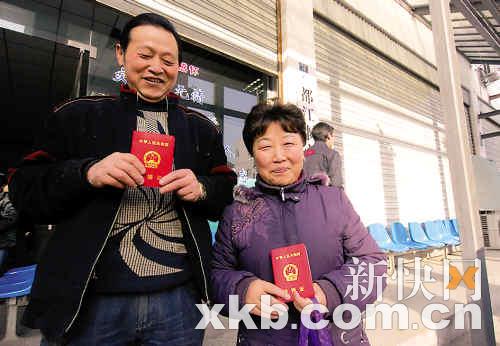 昨天早上10時,陽光明媚,重新拿到結(jié)婚證的譚興茂夫婦走出了辦證大廳!拔覀円郧暗慕Y(jié)婚證是張獎狀,好像是國家對我們愛情的表揚(yáng)。”譚興茂拿著小紅本本對記者說。不過對于新版的結(jié)婚證,譚興茂的妻子趙樹清很興奮,她非常幽默地說:“60多歲了,就當(dāng)又結(jié)了一次婚,可惜老頭子還是那個人……”即使如此,譚興茂還是打算回去再擺一次酒!凹词褂衼砩,我還是會娶她的!弊T興茂說。