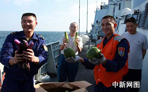 “海口”艦官兵高興地展示補(bǔ)給到艦上的新鮮蔬菜。 中新網(wǎng)記者 孫自法 攝
