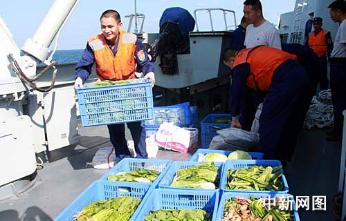 “海口”艦官兵搬運補(bǔ)給到艦上的新鮮蔬菜。 中新網(wǎng)記者 孫自法 攝