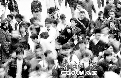 來自柳州的劉先生昨天搭乘K301次列車抵達廣州,他帶著老家的特產(chǎn)———烤鴨、雞、花生,打算送給在清遠鞋廠打工的工友和在廣東的老鄉(xiāng)。陜西寶雞人包永江前年因為一次意外的車禍致殘。昨天他拄著一雙拐杖,在廣州火車東站和諧號出站口等妻子。這是他第一次外出,因為妻子在自己打工的那家紡織廠里給他介紹了一份看門的工作,他從大年二十八就踏上了南下列車。為了省80元路費,他選擇先從寶雞轉到漢口,再從漢口乘慢車抵達廣州。因為妻子在黃金周長假期間加班,昨天下午才能從深圳趕過來接他。至昨天,他已經(jīng)連續(xù)在車站等了6天。他希望新年里,自己能為妻子分擔一些負擔,兩個人今年可以還清家里的欠帳。