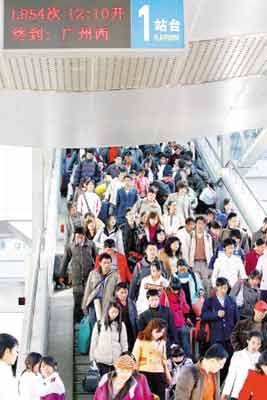 昨日上午10點(diǎn)半左右,昆明站已是人山人海,放眼望去,攜老扶幼、挎滿大包小包行囊的乘客正在秩序井然地通過安檢!白蛱斐丝瓦少很多,但今天一早開始,就明顯多了起來。和去年一樣,今年春節(jié)長假的客流回升期依然集中在初六、初七這兩天。”值班站長向婭說,昆明站春運(yùn)期間臨時增設(shè)了車票大賣場,現(xiàn)在至廣州、廈門的臥鋪票每天早上8點(diǎn)以前基本就售完。而為了應(yīng)對節(jié)后的客運(yùn)高峰,昨日增開了4趟省際、城際列車,分別發(fā)往廣州西、上海以及曲靖。