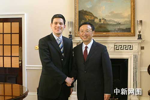 當(dāng)?shù)貢r(shí)間二月一日下午,陪同溫家寶訪英的中國(guó)外長(zhǎng)楊潔篪在倫敦會(huì)晤英國(guó)外交大臣米利班德。會(huì)見在倫敦的外交大臣官邸舉行。中新社記者 張朔攝
