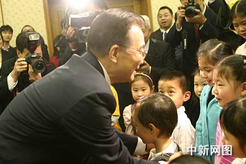 當(dāng)?shù)貢r間二月一日中午,正在訪英的中國總理溫家寶來到使館看望中國駐英外交官和華僑華人。一群衣著鮮艷的孩子向溫家寶獻(xiàn)上鮮花,并齊聲朗誦溫家寶的詩作《仰望星空》。溫家寶親熱地探下身與孩子們問好。中新社記者 張朔攝