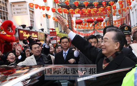 在每個地方,溫總理都在不停地講話,對政府首腦,對商界領(lǐng)袖,對華人華僑。一到倫敦,他第一時間去到唐人街,拿著麥克風,站在高臺上,面對兩千多人信心喊話。事后他說:“這次雖然是春節(jié)期間出訪,但是面對唐人街的那些中國同胞,一切都值得了!