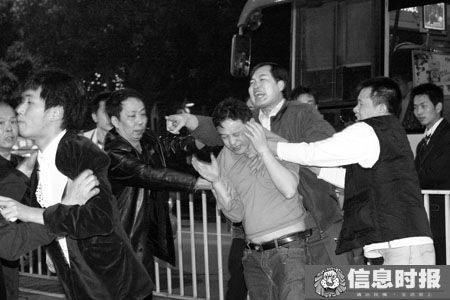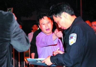 在現(xiàn)場(chǎng),記者看到該名穿淺紅色衣服的男子在不停打電話,該名男子身高大概1米65左右,情緒暴躁,揮舞手臂。在接受警方調(diào)查時(shí),該名男子忽然一拳將旁邊面包車司機(jī)的兒子陳家文打倒在地。隨后還推開(kāi)前來(lái)執(zhí)勤的交警!澳銈?nèi)?wèn)問(wèn),知不知道我是誰(shuí)?”該名男子向人群叫囂,現(xiàn)場(chǎng)一片混亂。 (信息時(shí)報(bào))