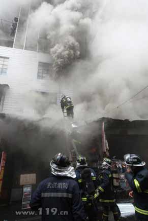 當(dāng)日上午9時(shí)51分,武漢市119指揮中心接到火災(zāi)報(bào)警后,立即調(diào)集21個(gè)消防中隊(duì)、79臺(tái)消防車、322名消防官兵趕赴現(xiàn)場(chǎng)進(jìn)行撲救。發(fā)生火災(zāi)的華貿(mào)商城為一幢9層商住樓,一樓為經(jīng)營(yíng)門(mén)面、2樓和3樓為倉(cāng)庫(kù),4樓以上為居民住宅。