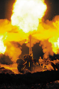 筆者看到,演習(xí)中他們始終用火力毀傷效果來控制戰(zhàn)斗進(jìn)程。中軍帳里,師、團(tuán)、營三級指揮員時(shí)而網(wǎng)上點(diǎn)對點(diǎn)發(fā)號施令,時(shí)而用密語下達(dá)作戰(zhàn)命令。副師長李春紅一語中的:“復(fù)雜電磁環(huán)境下作戰(zhàn),火力的地位和作用更加凸現(xiàn),由過去從屬地位的火力準(zhǔn)備行動上升為決定戰(zhàn)斗進(jìn)程的火力突擊行動!痹捯粑绰,電臺里傳來師長汪海江命令:“各攻擊群延緩攻擊;鹆f(xié)調(diào)組,立體補(bǔ)充聯(lián)合火力打擊!”
