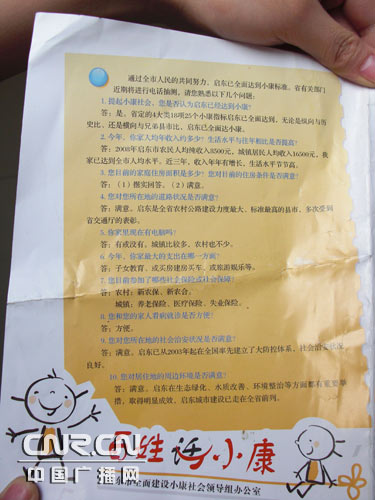 在多位村民家中,記者都看到了由啟東市全面建設(shè)小康社會(huì)領(lǐng)導(dǎo)小組辦公室印發(fā)的電話調(diào)查問卷。在這份印刷精美的問卷中共列有十個(gè)問題,并給出了標(biāo)準(zhǔn)答案。無論實(shí)際家庭人均年收入多少,農(nóng)村居民必須回答8500元,城鎮(zhèn)居民必須回答16500元。無論是否參加社會(huì)保險(xiǎn)或保障,都必須回答參加了;無論對住房、道路、居住環(huán)境是否滿意,都必須回答滿意。