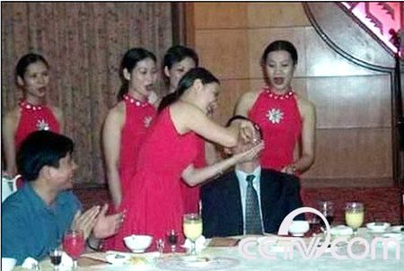 在其上傳的一組圖片中,雖然招待方設(shè)的酒宴依然豐盛,席間各種人物也都頻頻舉杯,但沒有酒店的服務(wù)小姐作陪敬酒。從圖片上可以看到,為了表示對(duì)客人的尊敬,招待方只是請(qǐng)了幾名身穿少數(shù)民族服飾的當(dāng)?shù)嘏,站在客人一?cè)陪同敬酒。