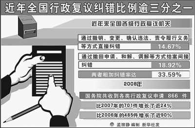“行政復(fù)議化解行政爭(zhēng)議的作用日益明顯。”2月19日,國(guó)務(wù)院法制辦主任曹康泰在全國(guó)行政復(fù)議工作經(jīng)驗(yàn)交流暨“雙先”、“雙優(yōu)”表彰大會(huì)上介紹,2008年,國(guó)務(wù)院共收到行政復(fù)議申請(qǐng)866件,比2006年增長(zhǎng)近90%,全國(guó)每年通過行政復(fù)議化解的行政爭(zhēng)議約8萬件左右。