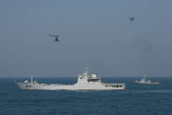 “艦艇編隊高速接近目標,保持距離進行跟蹤監(jiān)視;艦載機繼續(xù)進行跟蹤飛行!焙I现笓]員、基地副參謀長黃鳳至果斷下達指令,并向上級申請:“電子對抗部隊用短波對被劫持貨輪短波通信實施干擾;協(xié)調(diào)地方網(wǎng)管中心屏蔽恐怖分子IP地址,阻截與外部的通訊聯(lián)系和信息發(fā)送。”