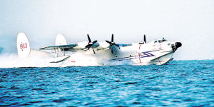 這是一架外形奇特的飛機:機翼兩側(cè)各垂有一個巨大的橄欖球狀物,機腹是傾斜的切割面形狀,好似巨輪的船身?吹接浾咭荒樢苫,值班領(lǐng)導、政委張汝翼為記者指點迷津:“這就是我們部隊號稱‘海天鯤鵬’的水上飛機,是全軍僅有的一種特殊機種,不僅能航行在遼闊的江河湖海,還能馳騁在藍天之上,機翼兩側(cè)配有保持浮力和平衡的‘浮筒’……”
