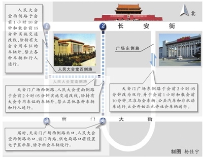 據(jù)介紹,在每次開會(huì)、散會(huì)前,天安門廣場(chǎng)西側(cè)路、人民大會(huì)堂南側(cè)路及人民大會(huì)堂西側(cè)路將分別采取交通管理措施,禁止各種車輛和行人通行。屆時(shí),天安門廣場(chǎng)西側(cè)路北口、人民大會(huì)堂西側(cè)路北口、前門西站、供電局路口將設(shè)置電子顯示屏,誘導(dǎo)社會(huì)車輛繞行。
