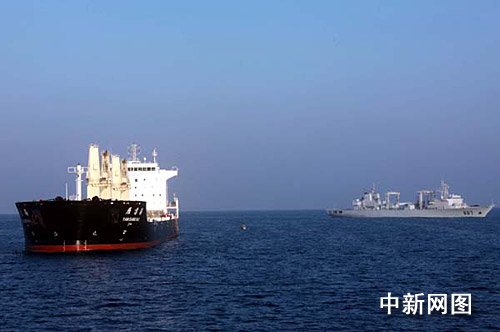 得知此事后,中國海軍護航編隊立即派距離事發(fā)海域200多海里外的“?凇迸灨咚偾巴幼o。2月26日清晨,“雁蕩!碧栐凇昂?凇迸灥淖o送下,順利抵達亞丁灣東部安全海域。分航前,護航編隊還派出醫(yī)務(wù)人員登上“雁蕩!碧,為受傷船員進行了身體檢查和包扎處理。
