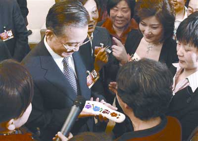 王金初向溫總理激動地說,“總理,我是來自農(nóng)村基層支部書記代表,有個(gè)80多歲的老人,要我送一雙鞋墊給你,她說她過上了好日子,要感謝總理。(鞋墊繡上)這個(gè)福就代表我們老百姓有這樣的總理,有福氣!”