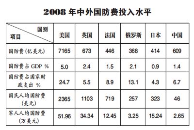 首先,應(yīng)當(dāng)看到中國國防費的投入是適度有限的。近年來,中國的國防費有了較大幅度的增長,似乎中國的國防費已經(jīng)很多了,但如果以歷史的、聯(lián)系的,而不是以孤立的、片面的觀點,來審視和分析中國的國防費問題,就會得出一個中國的國防費投入實際上并不多的客觀結(jié)論。從歷史上看,中國國防費投入的增長帶有明顯的補(bǔ)償性。根據(jù)國家統(tǒng)計局有關(guān)公開資料,從1979年到1989年,國防費平均增長為1.23%,與同期居民消費價格總指數(shù)平均上漲7.49%相比,實際年平均負(fù)增長超過6%。從1990年到1997年國防費年均增長15.8%,而同期居民消費價格總指數(shù)平均上漲9.7%,中國國防費排除物價因素后實際年均增長只有6.1%。直到1998年國家物價指數(shù)比較平穩(wěn)之后,為降低長期經(jīng)費不足給國防和軍隊建設(shè)帶來的影響,國防費投入才逐步有了較大幅度的實際增長。在長達(dá)10多年的“忍耐”過程中,中國國防和軍隊建設(shè)因經(jīng)費不足而受到很大影響。從中國自身的情況看,中國國防費的支出也是極其有限的。以這次兩會公布的有關(guān)數(shù)字為例,2009年中國國防費預(yù)算比上一年度執(zhí)行數(shù)增加了14.9%,占全國財政支出預(yù)算的6.3%,與前幾年相比,所占比重略有下降,而同期教育費增長22.5%、醫(yī)療衛(wèi)生費增長20.9%、社會保障和就業(yè)費增長23.1%、環(huán)境保護(hù)費增長22.3%、保障性安居工程經(jīng)費增長199.6%,可見國防費的增長在各項社會事業(yè)費的增長中是相對偏低的,中國始終堅持把主要的財力用于改善民生。再從國際上看,中國與美、英、法、俄、日等國家相比,無論是國防費占國家國內(nèi)生產(chǎn)總值(GDP)的比重還是占國家財政支出的比重,無論是國民人均國防費還是軍人人均國防費投入等主要指標(biāo)都是比較低的(如右表所示)。