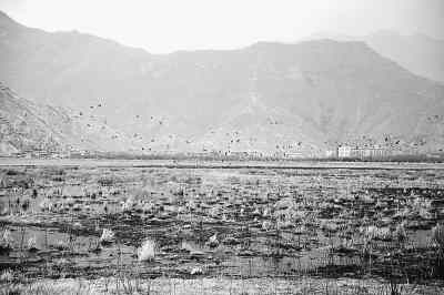 3月19日,拉薩西北郊的拉魯濕地內(nèi),枯草正在醞釀綠意,一群群鳥兒上下翻飛。
