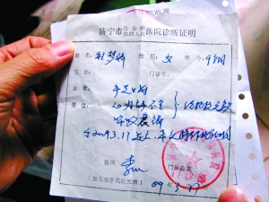 程傳勝,28歲,巨野縣章縫鎮(zhèn)程莊村人,他出具的女兒“診斷證明”上記載,程夢(mèng)嬌被診斷為“手足口病、心力不全、呼吸衰竭”,于2009年3月17日死亡,“特作此證明!边@份證明上,蓋有濟(jì)寧市傳染病醫(yī)院門診部的紅色印章。