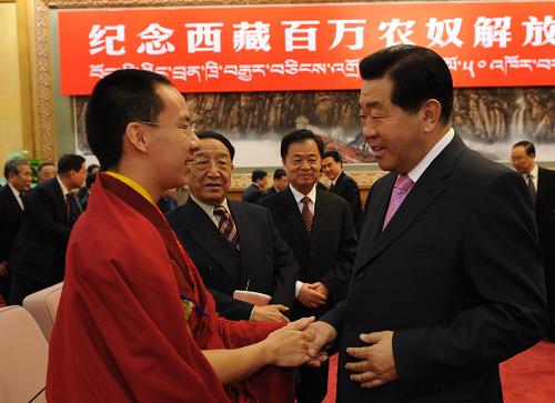 中新網(wǎng)北京3月27日電 紀(jì)念西藏百萬農(nóng)奴解放50周年座談會27日在北京人民大會堂舉行。中共中央政治局常委、全國政協(xié)主席賈慶林出席并講話。