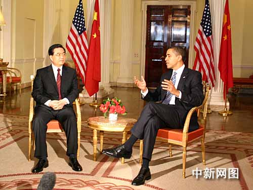 中新網(wǎng)倫敦4月1日電 中國(guó)國(guó)家主席胡錦濤當(dāng)?shù)貢r(shí)間一日下午在倫敦首次會(huì)見(jiàn)美國(guó)新任總統(tǒng)奧巴馬。胡錦濤說(shuō),中方愿同美方一道,共同推動(dòng)中美關(guān)系更大發(fā)展,我也愿意同奧巴馬總統(tǒng)建立起良好的工作關(guān)系和個(gè)人友誼。
