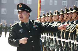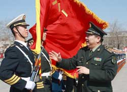 功夫不負有心人。負責閱兵訓練的邱巍高將軍,放心不下?lián)撥娖焓值奈,有一次他單獨考核我。那天,我撐?級風刮得獵獵作響的軍旗,抬腿帶風,落地砸坑,身后跟隨將軍前來的參謀用鋼卷尺測量,每一步都是標準的75厘米,將軍滿意地笑了。