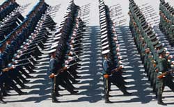 時間定格在1984年10月1日,首都北京,天安門廣場。可容納50萬人的世界第一大廣場上,人山人海,紅旗招展。9點40分,黨和國家領導人登上天安門城樓。10點整,閱兵式開始。真正考驗我的時刻到了!鄧小平主席講話完畢,雄壯的《義勇軍進行曲》響起,我將火紅的“八一”軍旗高擎在手中,正步走上天安門廣場,引導受閱大軍氣勢磅礴地通過天安門。天安門廣場由東到西743.25米,我踏著軍樂的節(jié)奏,按照每分鐘112步、每步75厘米的標準步幅,用時8分33秒、991步,分毫不差地落在了禮畢線上。方隊縱、橫、斜三線分明,踢腿帶風,足音如鼓,新聞媒體以“山的雄姿、海的壯闊”對儀仗方隊進行了報道。