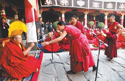 4月12日,來(lái)自西藏格魯派七大寺廟的9名考僧,在拉薩大昭寺通過(guò)嚴(yán)格考評(píng),獲得了藏傳佛教傳統(tǒng)最高學(xué)位——格西拉讓巴,近似于博士學(xué)位。圖為參加晉升格西拉讓巴學(xué)位活動(dòng)的考僧(左)與僧侶之間展開(kāi)激烈的辯論。(張帆 朱磊攝影報(bào)道)