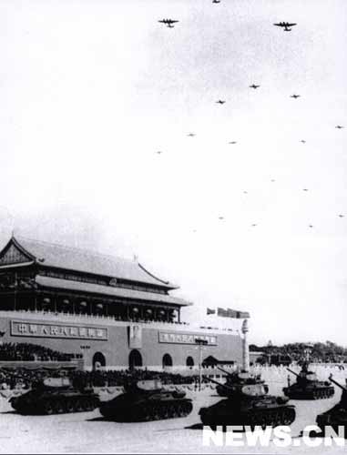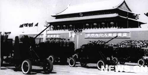 中國(guó)人民解放軍代理總參謀長(zhǎng)聶榮臻乘車率領(lǐng)武裝部隊(duì)進(jìn)入廣場(chǎng),通過檢閱臺(tái)前,向西行進(jìn)。全場(chǎng)熱烈鼓掌,向他們表示歡迎。