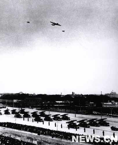 當(dāng)?shù)孛娌筷?duì)經(jīng)過廣場時,在天空出現(xiàn)了英勇的鐵鷹,兩架殲擊機(jī)護(hù)送著一架領(lǐng)航機(jī)飛在前1954面,接著重轟炸機(jī)、噴氣式轟炸機(jī)和殲擊機(jī),一隊(duì)一隊(duì)地掠過天安門上空。