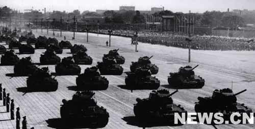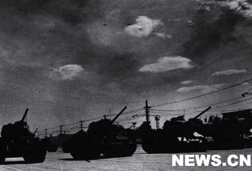 接著,受閱部隊(duì)開(kāi)始分列式。軍事學(xué)院的隊(duì)伍邁開(kāi)整齊的步伐首先走進(jìn)天安門(mén)廣場(chǎng)。緊跟在他們后面的是步兵學(xué)校、炮兵學(xué)校、工程兵學(xué)校、坦克學(xué)校、航空學(xué)校、海軍學(xué)校和水兵、公安軍、步兵、摩托化步兵、傘兵的隊(duì)伍。隨后,裝備著各種大口徑遠(yuǎn)射程大炮的炮兵部隊(duì)和威力強(qiáng)大的坦克部隊(duì)相繼通過(guò)了廣場(chǎng)。當(dāng)坦克部隊(duì)在天安門(mén)廣場(chǎng)出現(xiàn)時(shí),一隊(duì)隊(duì)噴氣式轟炸機(jī)和殲擊機(jī)風(fēng)馳電掣地飛過(guò)天安門(mén)上空。
