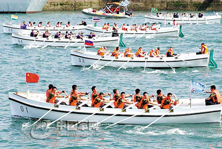 比賽在蔚藍(lán)的海上舉行,116艦的官兵們身著白色的海軍服列隊站在軍艦上觀看比賽。第一組共七支代表隊的隊員們奮力劃槳,白色的舢板逐漸劃向遠(yuǎn)處,宛如7只白色的海鷗貼著海面飛翔。站在記者身邊的印度“孟買”號軍艦的一位機(jī)電業(yè)務(wù)長說:“舢板比賽是一種最能體現(xiàn)合作精神的競技項目,大家齊心協(xié)力才能劃得快。今天的比賽是一個很好的紐帶,世界的海軍官兵們可以通過它建立友誼!”