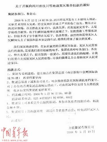 中國青年報記者多次采訪了其中的一名員工劉燕寧。劉燕寧告訴記者她就是捐款的經(jīng)辦人。2008年5月15日,汶川特大地震發(fā)生后,經(jīng)請示力聯(lián)集團負責(zé)人翟韶均,力聯(lián)集團發(fā)出了《關(guān)于開展向四川省汶川等地震災(zāi)區(qū)慈善捐款的通知》,號召廣大員工向災(zāi)區(qū)捐款。這一倡議得到了廣大員工的響應(yīng)和支持,很快,捐款源源而來。在指定的捐款截止日期——5月16日16:00前,公司募集到了地震捐款41423.1元。