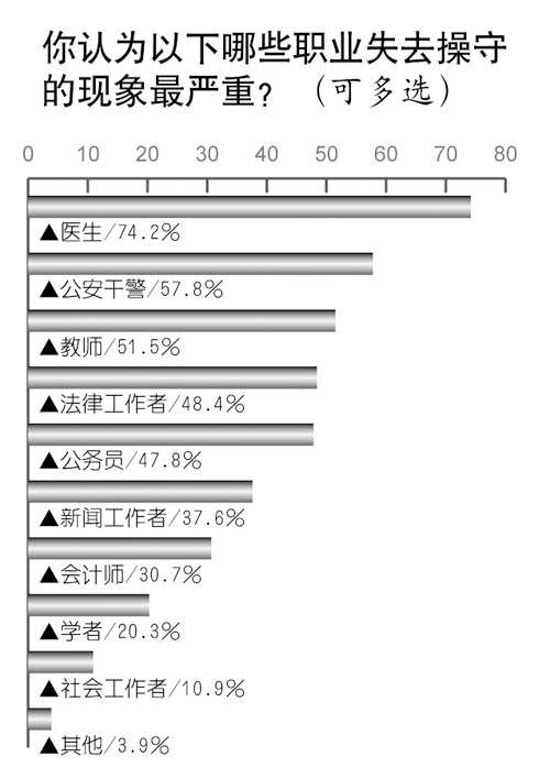 哪些職業(yè)失去操守的現(xiàn)象最嚴(yán)重?調(diào)查中公眾給出的排序依次為:醫(yī)生(74.2%)、公安干警(57.8%)、教師(51.5%)、法律工作者(48.4%)、公務(wù)員(47.8%)、新聞工作者(37.6%)、會計(jì)師(30.7%)、學(xué)者(20.3%)、社會工作者(10.9%)。