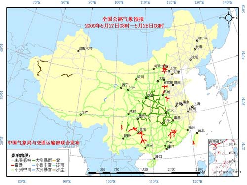 中新網(wǎng)5月27日電 中國氣象局與交通運輸部今日聯(lián)合發(fā)布“端午節(jié)”期間主要公路氣象預(yù)報。