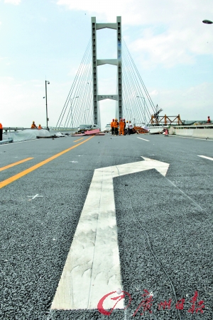記者來到橋中間的斷橋處,七八名工人正在斜拉橋與舊橋的“接縫”做修復檢測,負責對接施工的陳工告訴記者,從5月28日開始他們?yōu)樾屡f橋連接處施工彌合,昨天凌晨1時,正式為兩處各47米寬的縫隙裝上鋼梁自動伸縮設備,大橋橋面完全對接貫通無阻。
