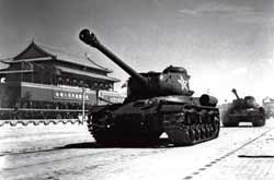 朱德總司令由聶榮臻司令員陪同乘車檢閱陸?杖姟7至惺介_始后,戰(zhàn)車方隊約在3點(diǎn)半發(fā)動車輛,并以嚴(yán)整的隊形和每小時15公里的速度通過天安門,接受檢閱。一百多輛戰(zhàn)車通過天安門時,恰與空中戰(zhàn)鷹編隊同步,場面顯得恢宏壯觀,大氣磅礴。