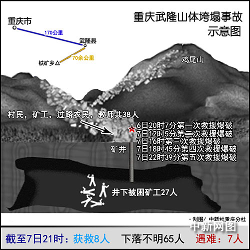 5日下午3時(shí)發(fā)生的重慶市武隆縣鐵礦鄉(xiāng)雞尾山山體垮塌災(zāi)害,直接導(dǎo)致山對(duì)面的三聯(lián)采礦場和幾所民居及一些路人被埋。經(jīng)過兩天兩夜的搜救工作,截至7日23時(shí),救援人員已發(fā)現(xiàn)7位遇難者遺體。包括此前救出的8名傷者和證實(shí)2名失蹤者當(dāng)時(shí)不在事故現(xiàn)場外,尚有65人下落不明,其中,被埋井下有礦工27人。