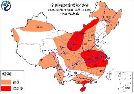 中新網(wǎng)6月17日電 中央氣象臺18時發(fā)布強(qiáng)對流天氣預(yù)報,預(yù)計(jì)今天夜間到明天白天,新疆北部和西南部、西北地區(qū)東部、內(nèi)蒙古大部、華北大部、東北大部、青藏高原東部、西南地區(qū)西南部和東北部、黃淮大部、湖北、江淮、江南大部、華南中南部等地將有雷暴天氣,其中,甘肅東部、寧夏、陜西北部、內(nèi)蒙古中東部地區(qū)局地有冰雹、短時強(qiáng)降水、雷雨大風(fēng)等強(qiáng)對流天氣,河南南部、安徽、江蘇大部、湖北大部、湖南東北部、江西北部、浙江、上海、福建北部、廣西東南部、廣東西南部、海南局部有短時強(qiáng)降水、雷雨大風(fēng)等強(qiáng)對流天氣。