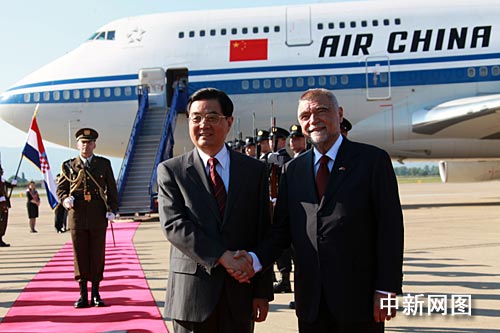 克羅地亞總統(tǒng)梅西奇親自到機(jī)場(chǎng)迎接,身著民族服裝的克羅地亞少年兒童向胡錦濤主席獻(xiàn)上美麗的鮮花,儀仗隊(duì)列隊(duì)向中國(guó)貴賓致敬。中國(guó)駐克大使吳連起率使館工作人員、中資機(jī)構(gòu)和留學(xué)生和華人華僑代表到機(jī)場(chǎng)歡迎胡錦濤主席。
