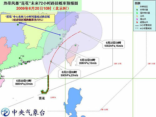 中新網(wǎng)6月20日電 中央氣象臺今天上午十時發(fā)布臺風橙色警報:今年第 3 號熱帶風暴“蓮花”( LINFA )的中心今天上午 10 時位于東沙島東偏南方大約 60 公里的南海北部海面上,就是北緯 20.5 度,東經 117.5 度,中心附近最大風力有 9 級( 23 米 / 秒)。