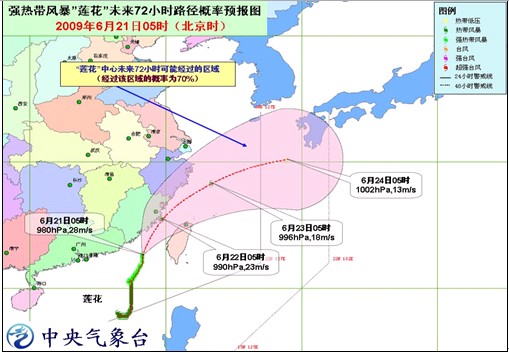 預(yù)計(jì),“蓮花”將以每小時(shí)15公里左右的速度向北偏東方向移動,逐漸向福建福清到漳浦一帶沿?拷,有可能于今天下午到夜間在這一帶沿海登陸;也有可能擦過福建省近海海面,沿臺灣海峽向東北方向移動,強(qiáng)度逐漸減弱。