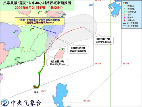 中新網(wǎng)6月21日電 中央氣象臺今天下午六時發(fā)布臺風(fēng)橙色警報:今年第3號熱帶風(fēng)暴“蓮花”(LINFA)的中心今天下午5時位于福建省晉江近海海面上,就是北緯24.2度,東經(jīng)118.5度,中心附近最大風(fēng)力有9級(23米/秒)。預(yù)計,“蓮花”將以每小時15公里左右的速度向偏北方向移動,即將在福建晉江附近沿海登陸,登陸后將沿福建中部沿海地區(qū)向北偏東方向移動,強(qiáng)度將很快減弱。