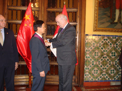 中新網(wǎng)6月23日電 據(jù)中國外交部網(wǎng)站消息,6月22日,秘魯外長加西亞向即將離任的中國駐秘魯大使高正月授予秘魯太陽大十字級勛章。我館政務(wù)參贊虞越、秘第一副總統(tǒng)詹彼得里、外貿(mào)旅游部長阿勞斯、部分政界高官、國會議員、駐秘使團代表、企業(yè)界等各界友好人士等50多人出席。